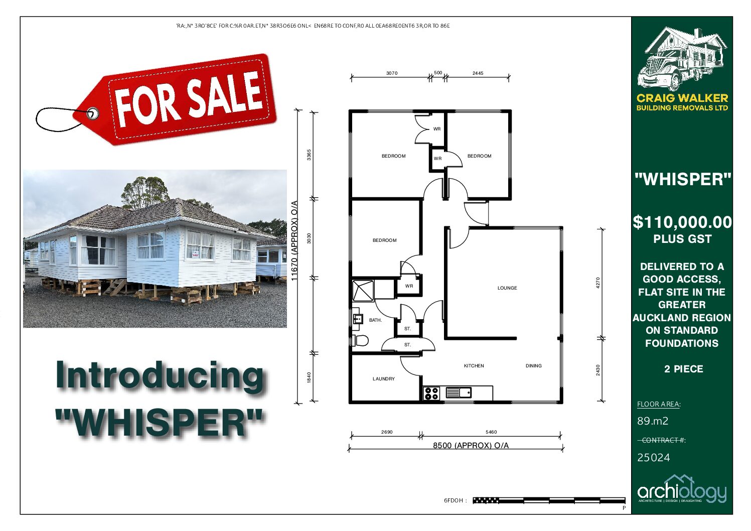 Whisper will be transported in two sections. We have allowed within the price to transport within the wider Auckland area BOMBAYS to WARKWORTH to a good access level building platform and install new standard foundations. If your site is outside of Auckland south or Warkworth north NO PROBLEM AT ALL, give us a call and we can provide the additional transport cost. If you think the delivery to your site might challenging or your site is not good access and not level, NO PROBLEM AT ALL, give us a call and we can view your site online or visit the site to to determine viability.
